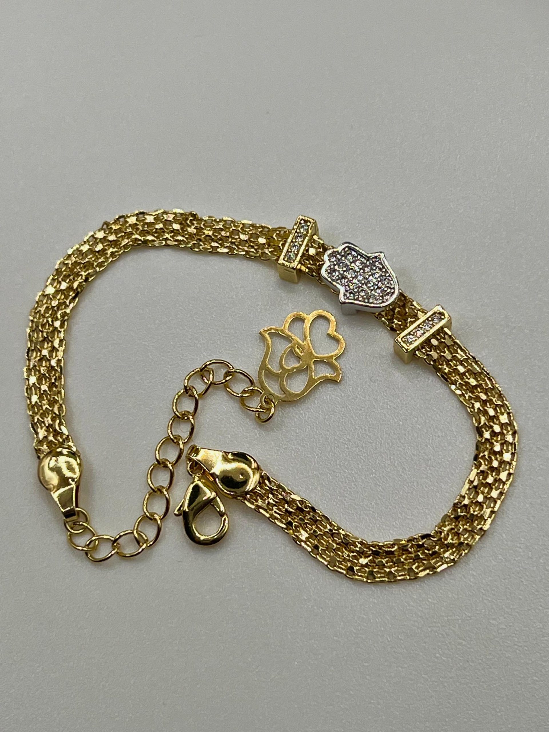 Cette gourmette dorée séduit par son design raffiné : une double chaîne élégante, un médaillon central incrusté de pierres scintillantes, et une khmissa ajourée en pendentif final. Un bijou lumineux au style affirmé, parfait pour sublimer votre poignet avec finesse et caractère.